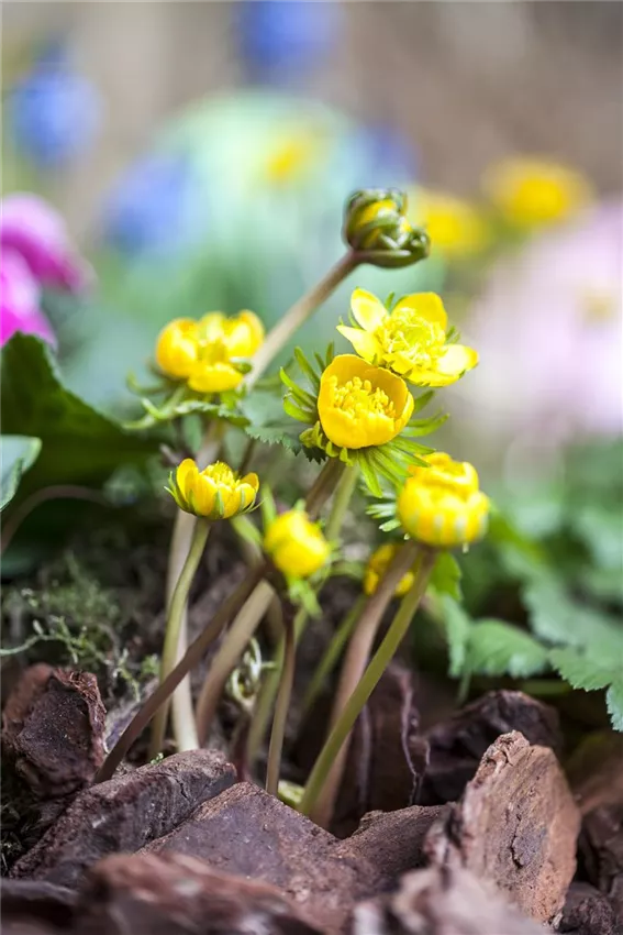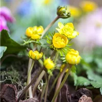 Die Knollen der Winterlinge werden 3 bis 5 Zentimeter tief in den Boden gesetzt. Halten Sie einen Abstand von 8 bis 10 Zentimetern ein: Blütenteppiche bilden die Pflanzen im Laufe der Zeit ganz von selbst. Um dem Winterling die Kältephase angenehm zu machen, können Sie die Pflanzstelle mit Kompost abdecken. Zwischen Februar und März recken die Winterlinge dann ihre Köpfe und freuen sich über eine regelmäßige Versorgung mit Humus, zum Beispiel durch Laub oder weiteren Kompost. Es reicht, diesen um die Pflanze herum zu verteilen. Einarbeiten in den Boden birgt die Gefahr, die flach vergrabene Knolle freizulegen. Winterlinge kann man hervorragend mit anderen Frühblühern kombinieren. Dafür können Sie auch eine Rasenfläche nutzen. Diese sollten Sie dann allerdings nicht vor Ende Mai mähen, weil das Laub des Winterlings erst dann einzieht. Sollten Sie sich dafür entscheiden, blühende Exemplare zu kaufen, können Sie diese im Frühling direkt in den frostfreien Boden pflanzen.