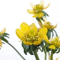 Am weitesten verbreitet ist der heimische Winterling (Eranthis hyemalis). Er stammt ursprünglich aus dem Süden Europas. Dort wächst er in Laubwäldern, Gebüschen und Weinbergen. Hierzulande wird der Winterling bereits seit 4 Jahrhunderten kultiviert. Er ist anspruchslos und pflegeleicht, das macht ihn zu einem beliebten Gartenbewohner. Ganz ohne Mühen können Sie mit Winterlingen große Farbflächen in Ihren Garten zaubern. Und diese kommen schon früh aus dem Boden. Bei Temperaturen knapp über dem Gefrierpunkt treiben Winterlinge aus und zeigen sich bald in ihrer vollen Pracht. Diese präsentiert sich mit 5 bis 15 Zentimetern Wuchshöhe und 2,5 Zentimeter großen Blüten. Trotz ihrer geringen Größe fallen Winterlinge ins Auge, weil sie dem Betrachter sonnengelb entgegenstrahlen. Die Blätter sitzen direkt unter der Blüte und hängen dort palmartig hinab. Sie wirken wie das gespiegelte Ebenbild der Blüte in saftigem Grün.